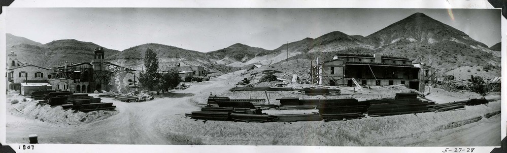 Panoramic view looking north during Upper Grapevine Ranch construction. May 27, 1928. Photographer unknown but likely Mat Roy Thompson. Scotty's Castle Main House and Annex with construction material in front. Annex Flag Tower construction ramp in place. Cook House with roofing tiles stacked in front. Hacienda roof stacked with tiles. Construction material stacked between Hacienda and road leading to Stables. Inscription in black ink, bottom right: 5-27-28. Number in black ink in left corner refers to historic photograph numbering system: 1807. Reverse not examined. Black and white, horizontal format, 3 x 12 inch, panorama. Corner mounted and adhered to photograph album DEVA 13732, Page 25 Reverse with photographs DEVA 40770 - 40702.