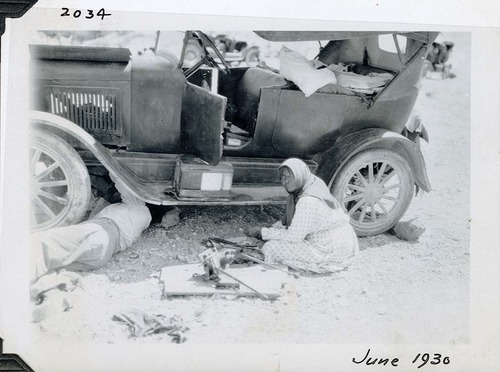 Woman sitting on ground next to passenger vehicle and parts probably assisting the man working under the car. June 1930. Photographed by Mat Roy Thompson. Front bench seat looks pulled. Maybe battery on running board. Back seat filled with items. Parts on ground are floor gear shifts. In black ink, lower right: June 1930. Number in black ink at top left refers to historic photograph numbering system: 2034. Black and white, horizontal format, 3 x 5 inch. Corner mounted on photograph album page.