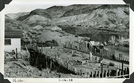 Scotty's Castle Hacienda concrete basement and flat slab roof / floor poured. Two unidentified laborers. In distance, Indian Camp, Fire Cache, and Stables before remodeling. January 14, 1928. Photographed by Mat Roy Thompson.