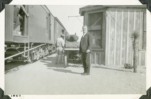 Man in suit with pipe standing near Santa Fe railroad cars on tracks. Circa May 1923. Men unloading train in background. Building on right. Date based on earlier catalog record. Number in black ink at bottom left refers to historic photograph numbering system: 1047. Listed in earlier catalog record Other Numbers Field: 6. Black and white, 3 x 5 inch, horizontal format. Corner mounted on photograph album page.