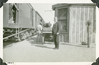 This is an historic black and white photograph from the Scotty's Castle Historic Photograph Collection, Death Valley National Park of main in suit standing in front of a delivery train on left, wagon in center, an board and bat building on right. Man standing in doorway of box car. Another man standing next to loaded wagon. Small Joshua tree on right. Number in black ink in lower left corner.