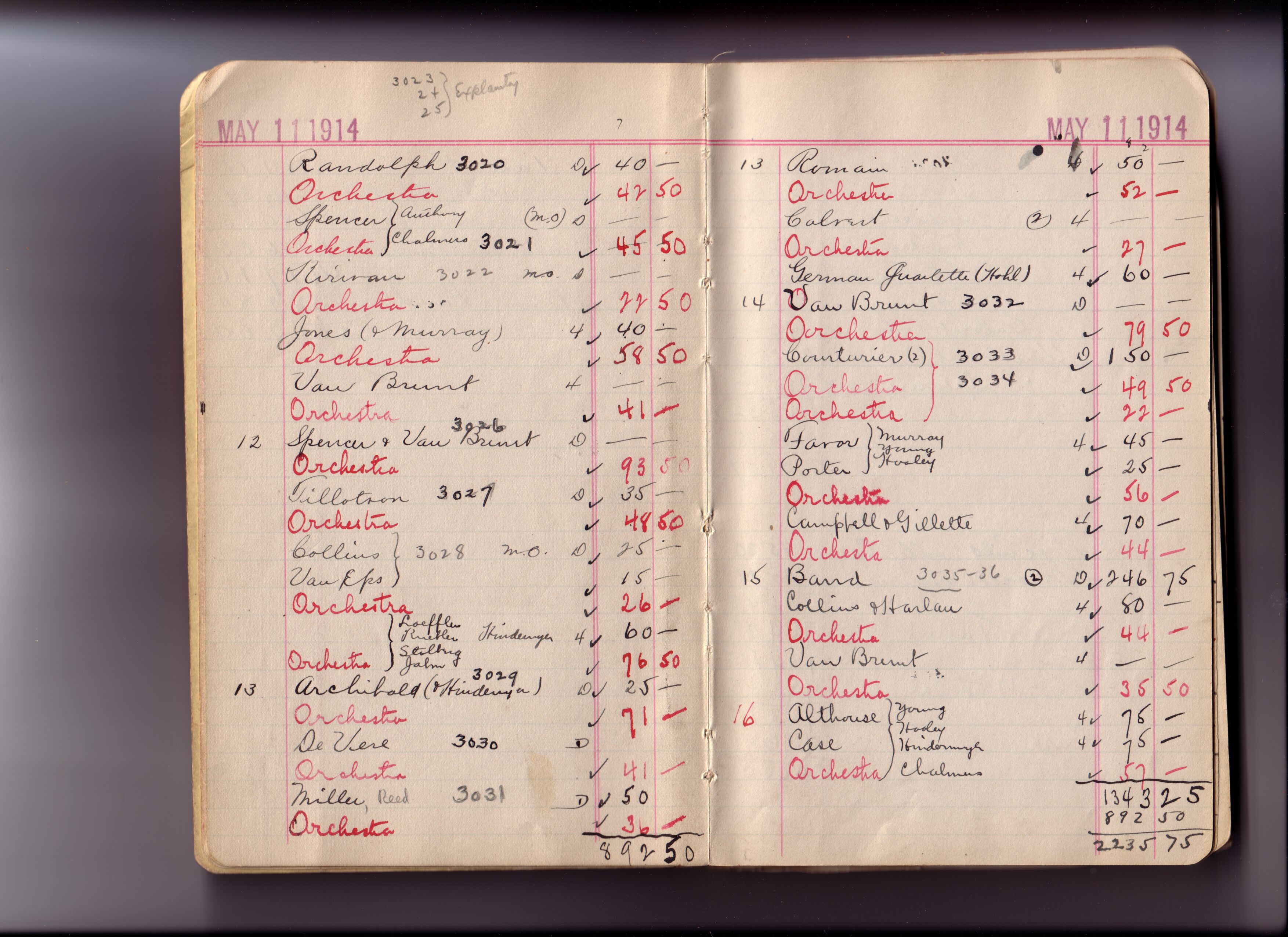 Thomas Edison's New York City Recording Studio Cash Book 11 (of 21), Image 08 (of 89). (Notebook #: PN-14-04-27, NPS catalog #: EDIS 1422), This book documents Diamond Disc matrices 2979 – 3791, expenditures for recording artist fees and other payments authorized by studio manager Walter H. Miller from April 27, 1914 – May 15, 1915. Digitally scanned December 2004 through July 2005 at resolution 300 dpi, 24 bit.