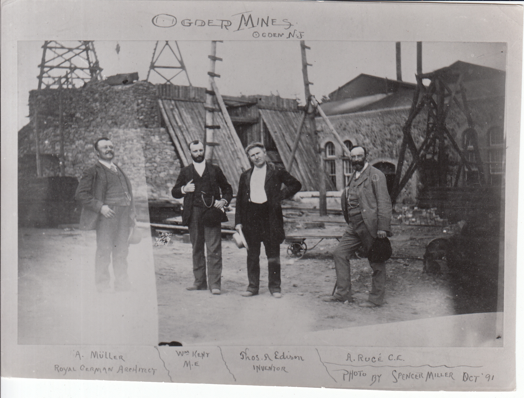 Thomas Edison and others at Ogdensburg mine. From left to right - A. Muller, Royal German Architect ; William Kent, M.E. ; Thos. A. Edison Inventor ; A. Ruce C. E.