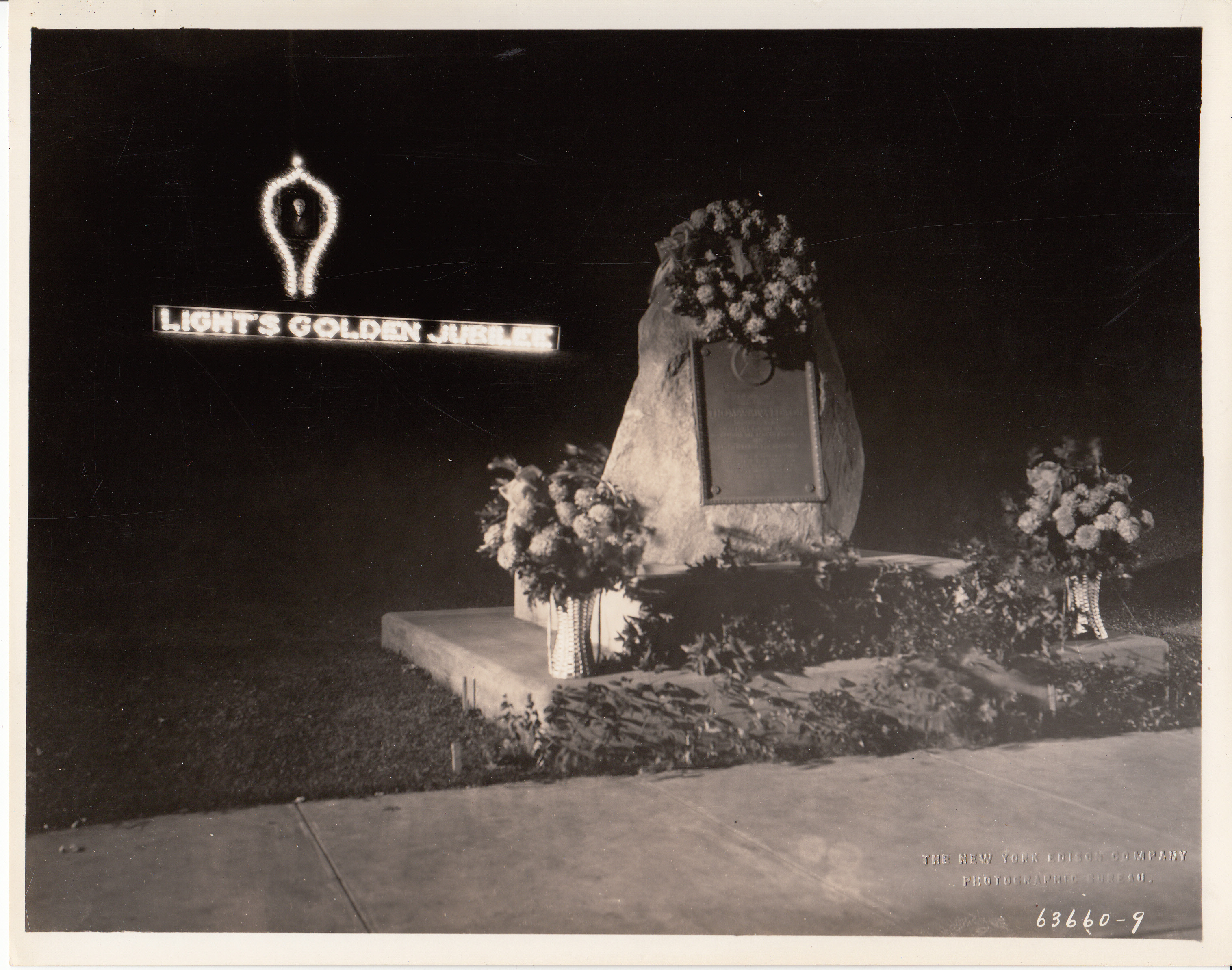 Sign and model of incandescent lamp illuminated at night behind Menlo Park memorial for Light's Golden Jubilee.