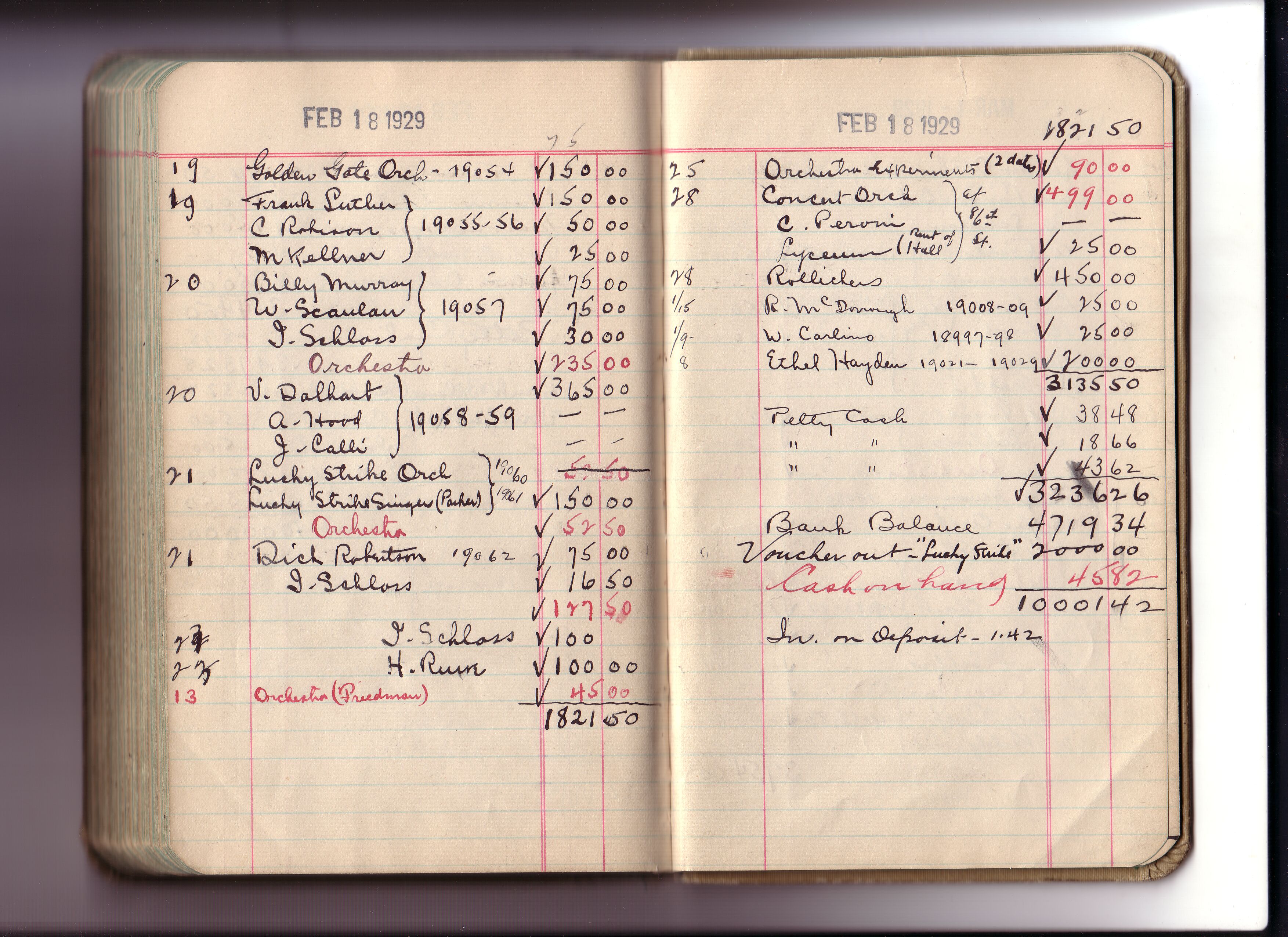 Thomas Edison's New York City Recording Studio Cash Book 20 (of 21), Image 88 (of 99). (Notebook #: PN-27-06-01, NPS catalog #: EDIS 1431), This book documents Diamond Disk matrices: 11720 – 19136, Needle Type matrices: N-100 – N-829, expenditures for recording artist fees and other payments authorized by studio manager Walter H. Miller from June 01, 1927 – March 30, 1929. Digitally scanned December 2004 through July 2005 at resolution 300 dpi, 24 bit.