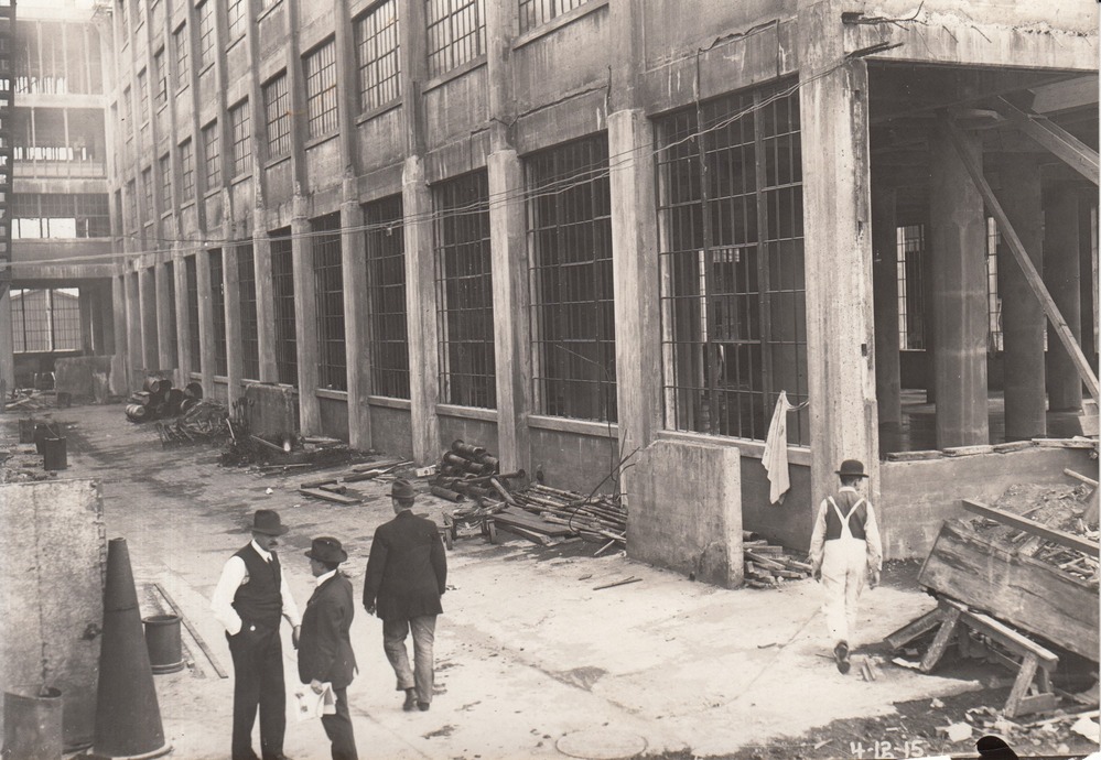 Phonograph Works Building during reconstruction, Miller Reese Hutchison in foreground.