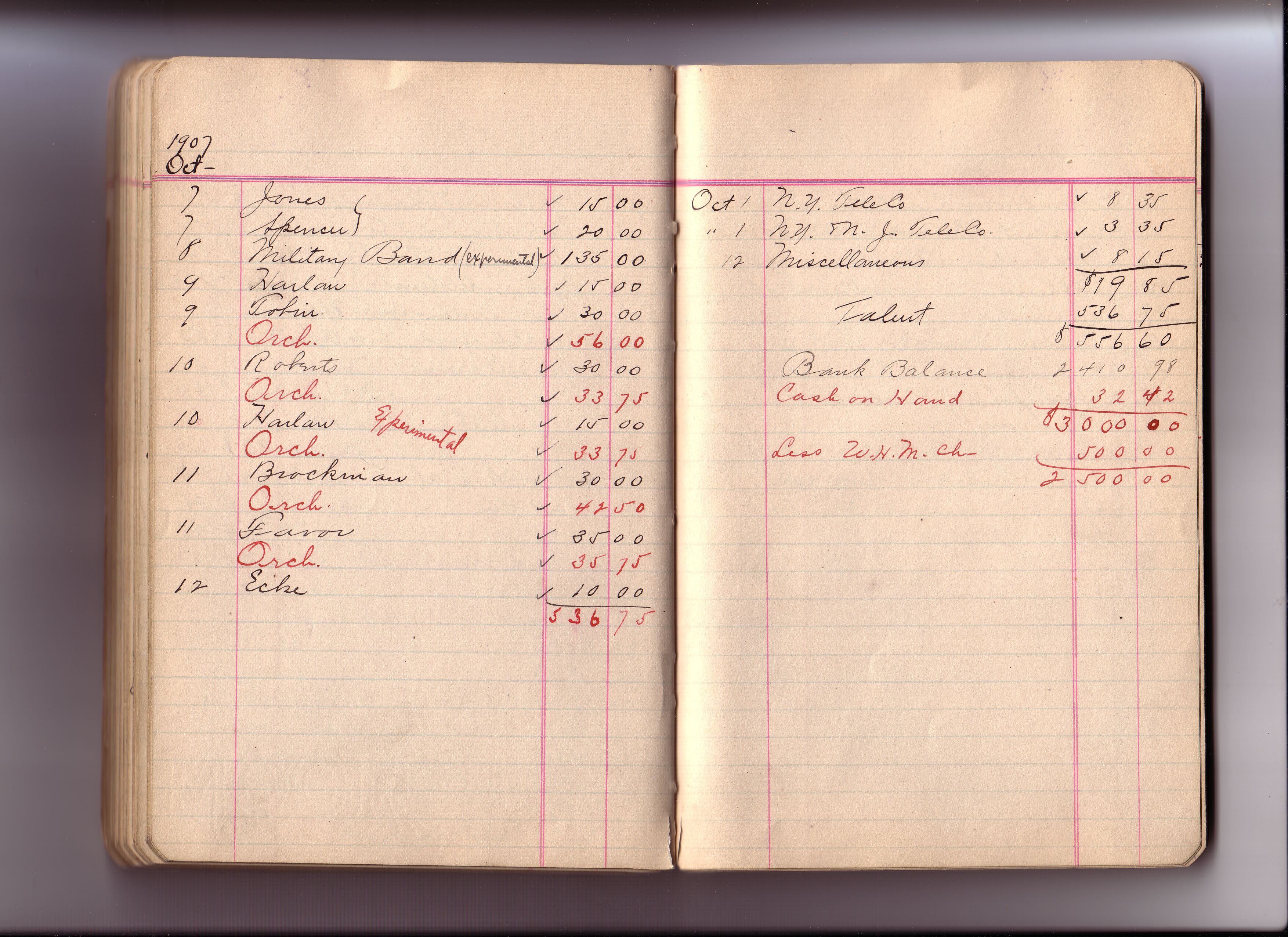 Thomas Edison's New York City Recording Studio Cash Book 03 (of 21), Image 69 (of 93). (Notebook #: PN-06-07-02, NPS catalog #: EDIS 1414), This book documents expenditures for recording artist fees and other payments authorized by studio manager Walter H. Miller from July 02, 1906 – February 08, 1908. Digitally scanned December 2004 through July 2005 at resolution 300 dpi, 24 bit.