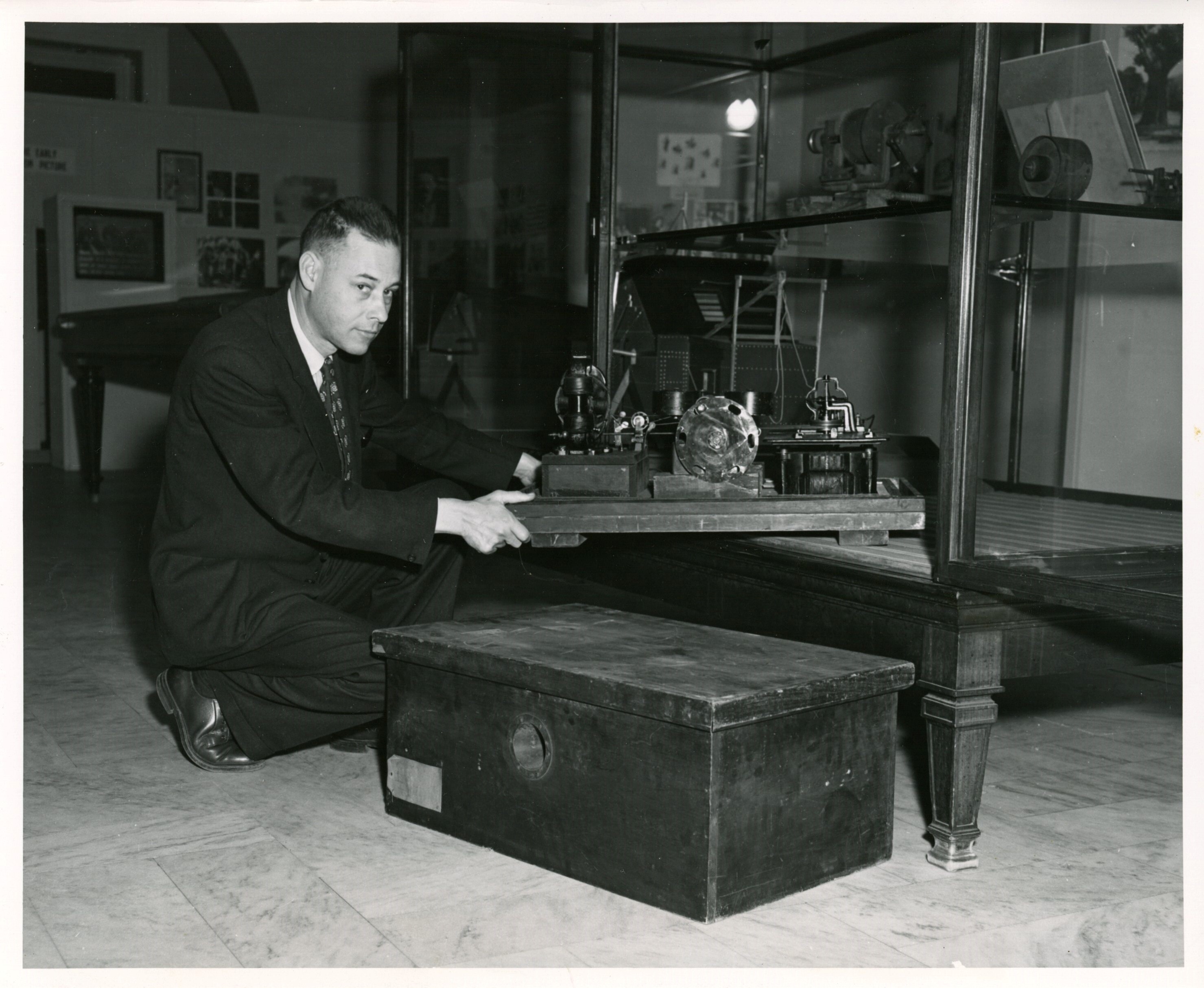 Man moving Edison strip kinetograph into display case at library of congress.