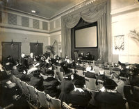 Thomas and Mina Edison on the platform of the Auditorium of the American Telephone and Telegraph Company, Palace of Liberal Arts, Exposition Grounds, San Francisco, California. The occasion of the demonstration between San Francisco and West Orange, NJ. Mr. and Mrs. Edison are talking to their personal friends and heads of the various departments of the Edison interests at the Edison Works. In the Auditorium at the time were Samuel Insull, Henry Ford and many close friends of Mr. and Mrs. Edison