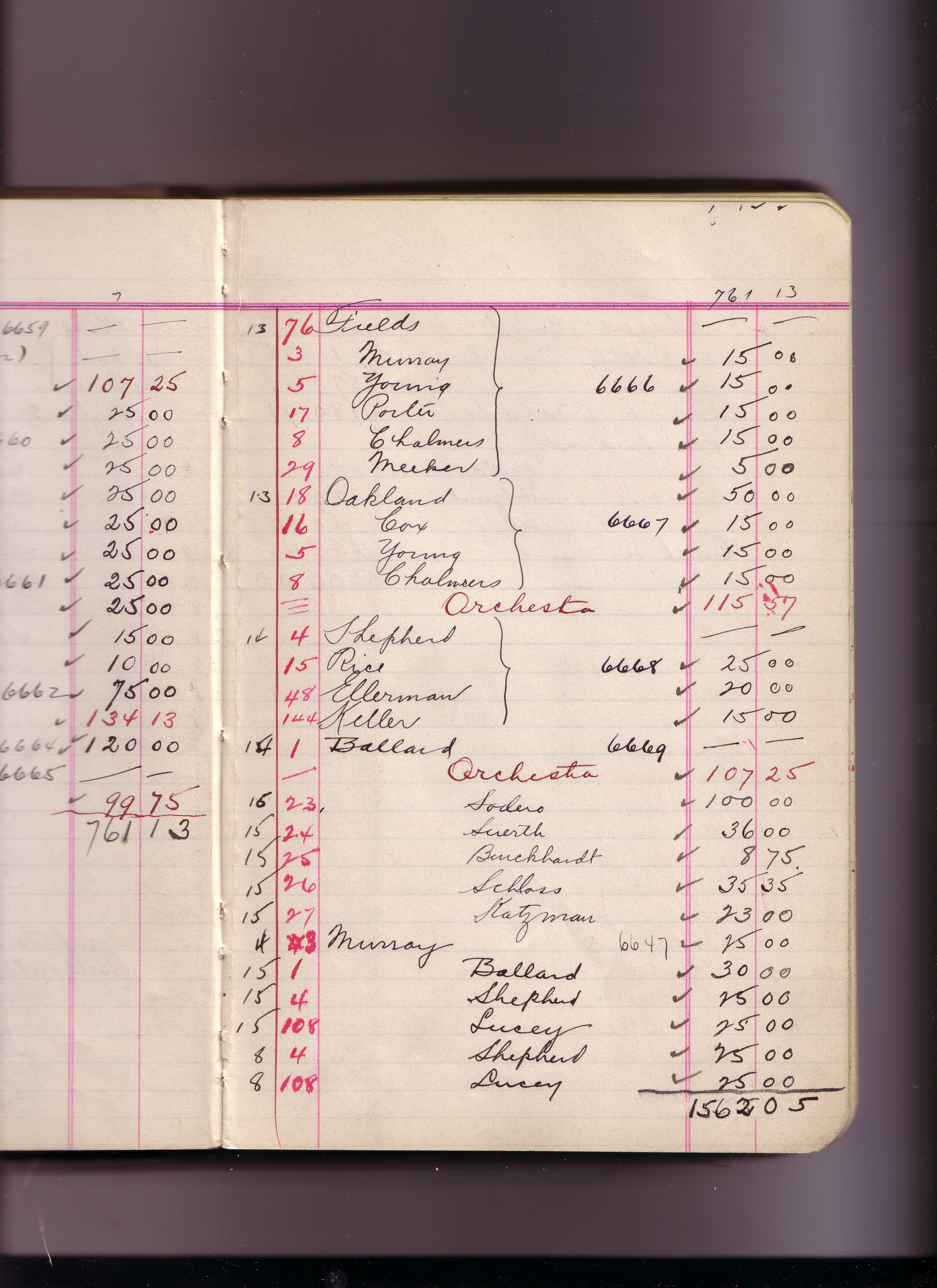 Thomas Edison's New York City Recording Studio Cash Book 16 (of 21), Image 103 (of 305). (Notebook #: PN-18-05-01, NPS catalog #: EDIS 1427), This book documents Diamond Disc matrices 6147 – 7712, expenditures for recording artist fees and other payments authorized by studio manager Walter H. Miller from May 01, 1918 – December 27, 1920. Digitally scanned December 2004 through July 2005 at resolution 300 dpi, 24 bit.