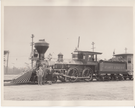 The engine "Sam Hill," which Thomas Edison rode as a boy, pulling the Presidential train. Three people are posed in front of the train - possibly the train engineer and his family. Train car just behind engine reads: "Atlantic & Gulf R.R."