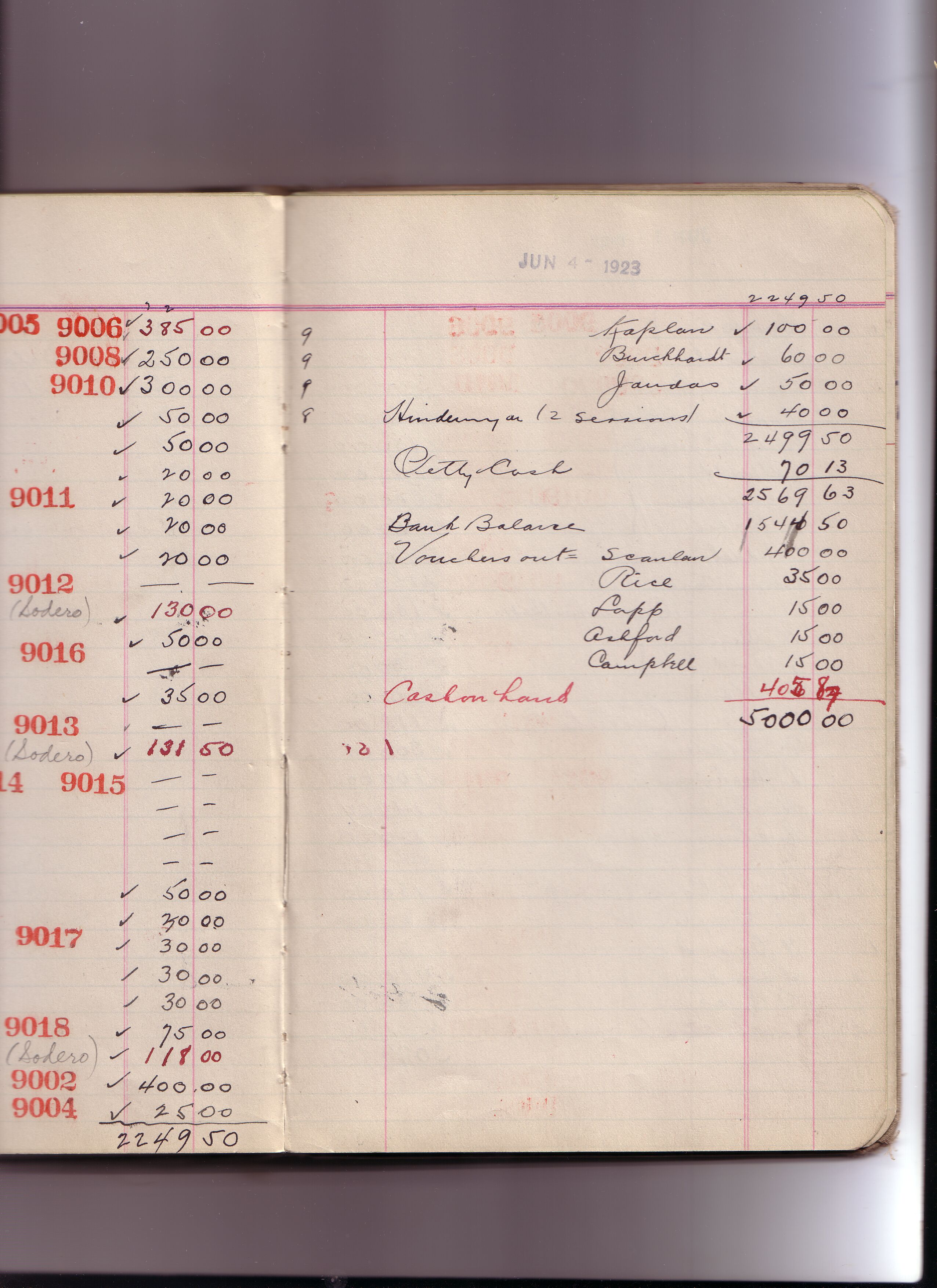 Some of the markings made in pencil in these cash books were made by ENHS Curator Leah Burt during the 1970s and/or early 1980s. For Leah Burt handwriting examples see pages for: December 19, 1921 (cash book 17) ; February 12, 1923 (cash book 17) ; October 27, 1924 (cash book 18) ; December 01, 1925 (cash book 19).