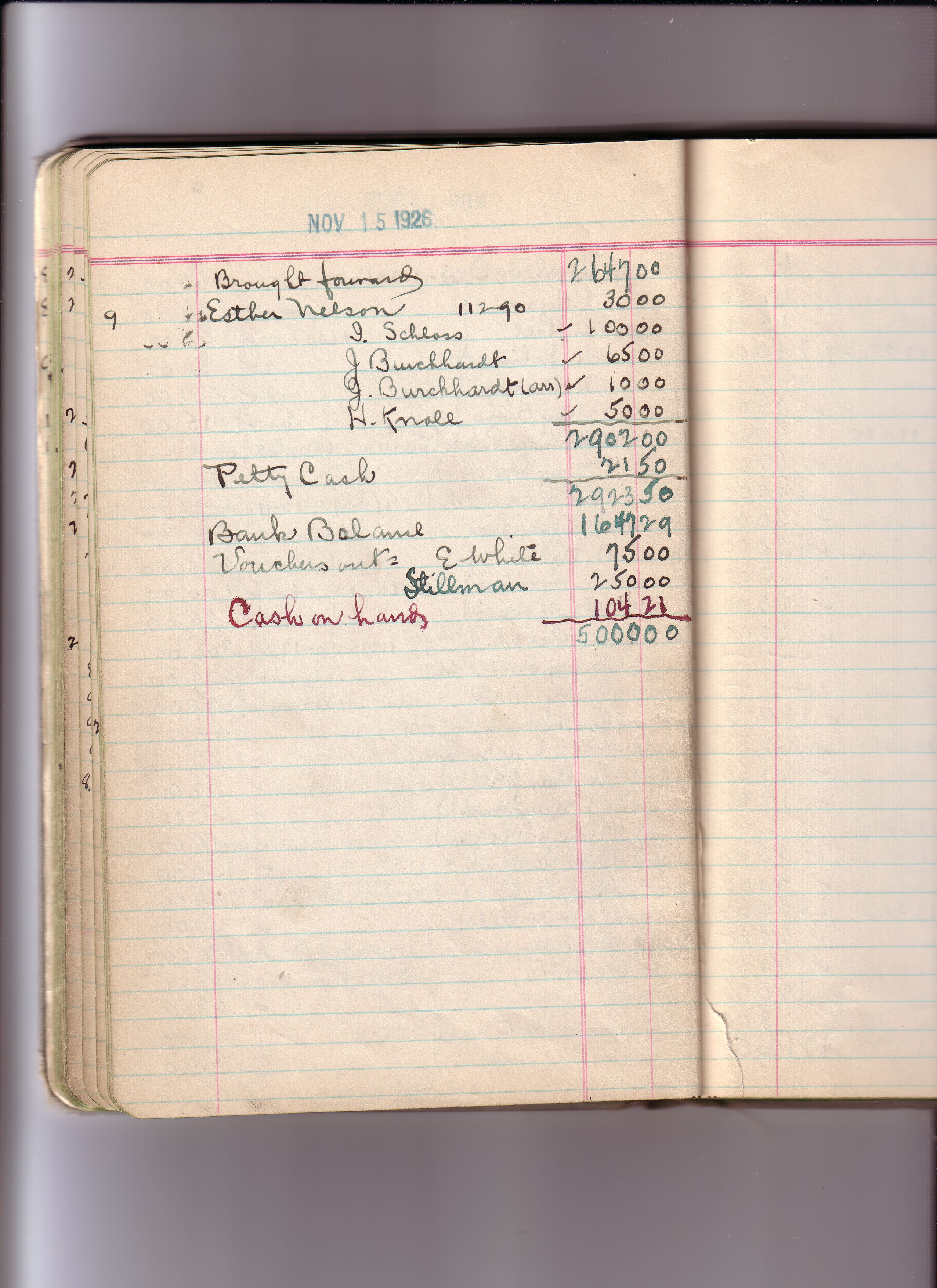 Some of the markings made in pencil in these cash books were made by ENHS Curator Leah Burt during the 1970s and/or early 1980s. For Leah Burt handwriting examples see pages for: December 19, 1921 (cash book 17) ; February 12, 1923 (cash book 17) ; October 27, 1924 (cash book 18) ; December 01, 1925 (cash book 19).