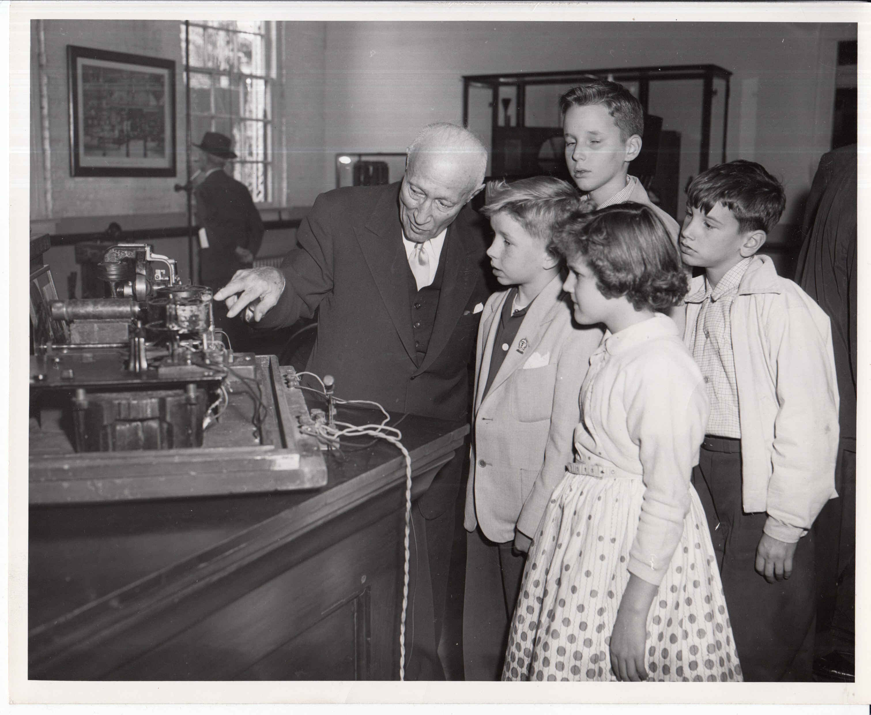 Adolph Zukor, Paramount Pictures Corp., showing 1889 strip kinetograph to West Orange school children during dedication ceremonies of Black Maria replica.
