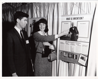 Visitors looking at poster, "What Is Invention," at unidentified exhibition.