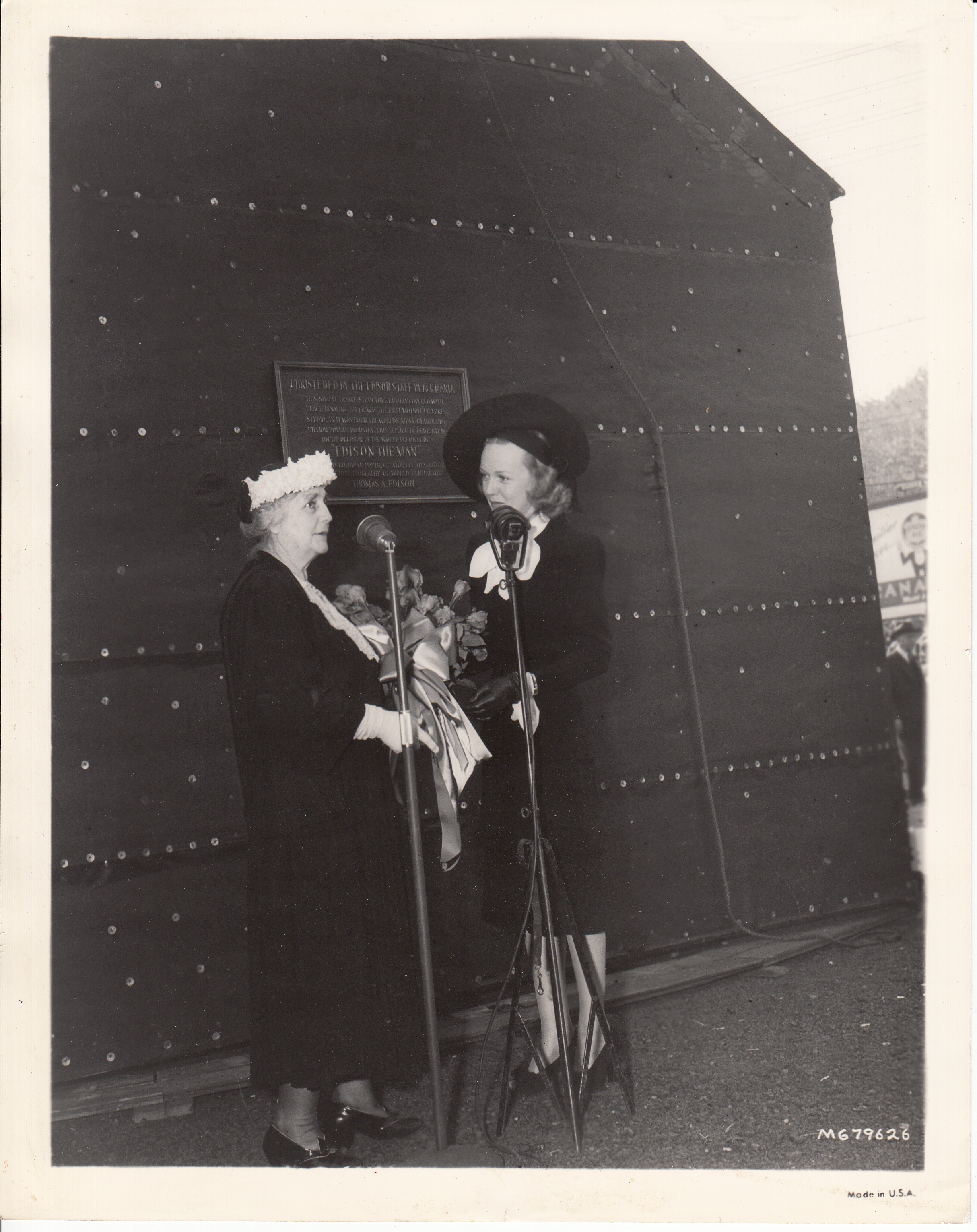 Mina Edison and Rita Johnson in front of the Black Maria during Edison Pageant of Progress.