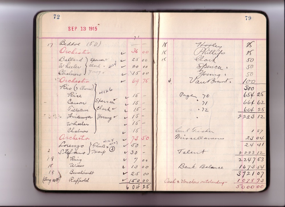 Thomas Edison's New York City Recording Studio Cash Book 12 (of 21), Image 44 (of 88). (Notebook #: PN-15-05-17, NPS catalog #: EDIS 1423), This book documents Diamond Disc matrices 3792 – 4369, expenditures for recording artist fees and other payments authorized by studio manager Walter H. Miller from May 17, 1915 – December 30, 1915. Digitally scanned December 2004 through July 2005 at resolution 300 dpi, 24 bit.