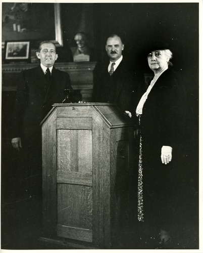 Will Hays, left, Mina Edison Hughes, and unidentified man at celebration of fiftieth anniversary of motion pictures.