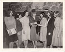Rita Johnson giving autographs to a group of girls. Yearbook one girl is holding says "Upsalite 1940". The yearbook was from Upsala College in East Orange, New Jersey