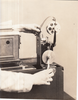 Publicity shot, girl showing lantern slide projector on Edison home projecting kinetoscope.