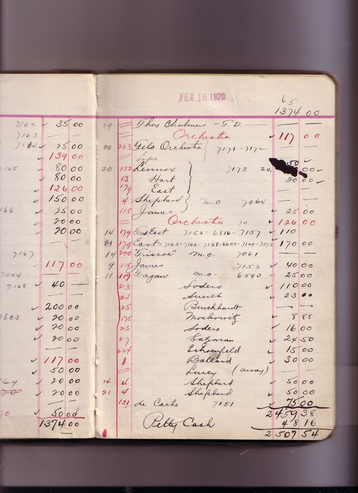 Thomas Edison's New York City Recording Studio Cash Book 16 (of 21), Image 209 (of 305). (Notebook #: PN-18-05-01, NPS catalog #: EDIS 1427), This book documents Diamond Disc matrices 6147 – 7712, expenditures for recording artist fees and other payments authorized by studio manager Walter H. Miller from May 01, 1918 – December 27, 1920. Digitally scanned December 2004 through July 2005 at resolution 300 dpi, 24 bit.