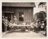 This photo depicts the presentation of Henry Ford formally receiving the building for his museum in Dearborn, Michigan. This building was used for glassblowing at Thomas Edison's original Menlo Park, NJ laboratory.