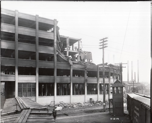 Collapsed corner of Building 11, taken from Erie railroad.