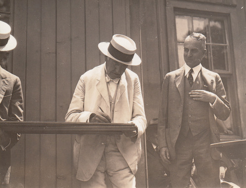 Thomas Edison and Henry Ford (obscured at left), autographing board at presentation of Glass House to Ford.