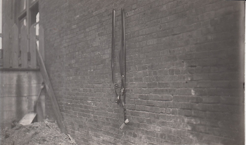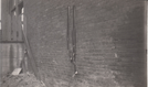Flammability test for film used in Edison home projecting kinetoscope, film attached to wall of building, prior to ignition.