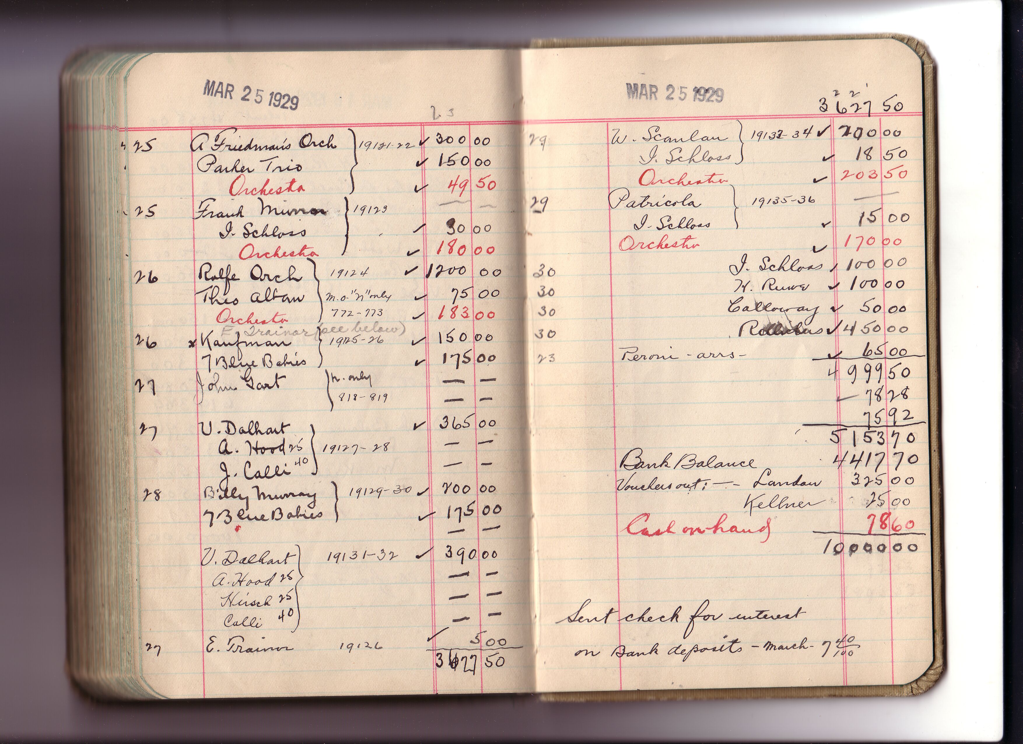 Thomas Edison's New York City Recording Studio Cash Book 20 (of 21), Image 93 (of 99). (Notebook #: PN-27-06-01, NPS catalog #: EDIS 1431), This book documents Diamond Disk matrices: 11720 – 19136, Needle Type matrices: N-100 – N-829, expenditures for recording artist fees and other payments authorized by studio manager Walter H. Miller from June 01, 1927 – March 30, 1929. Digitally scanned December 2004 through July 2005 at resolution 300 dpi, 24 bit.