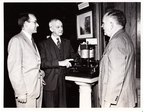 John T.H. Dempster, President of Edison Pioneers, examines model of generator with John E. Sloane, left, Thomas Edison's grandson, and Eugene Reel, Secretary of Edison Pioneers.