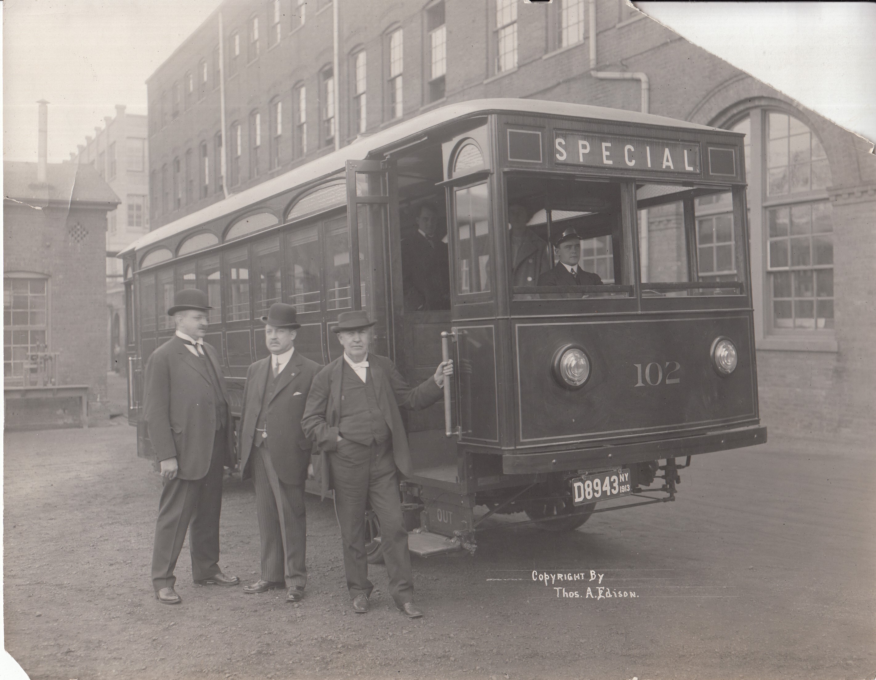 Thomas Edison and others with Beach Bus made by the Electric Coach Corp., and scheduled to operate to Atlantic City.