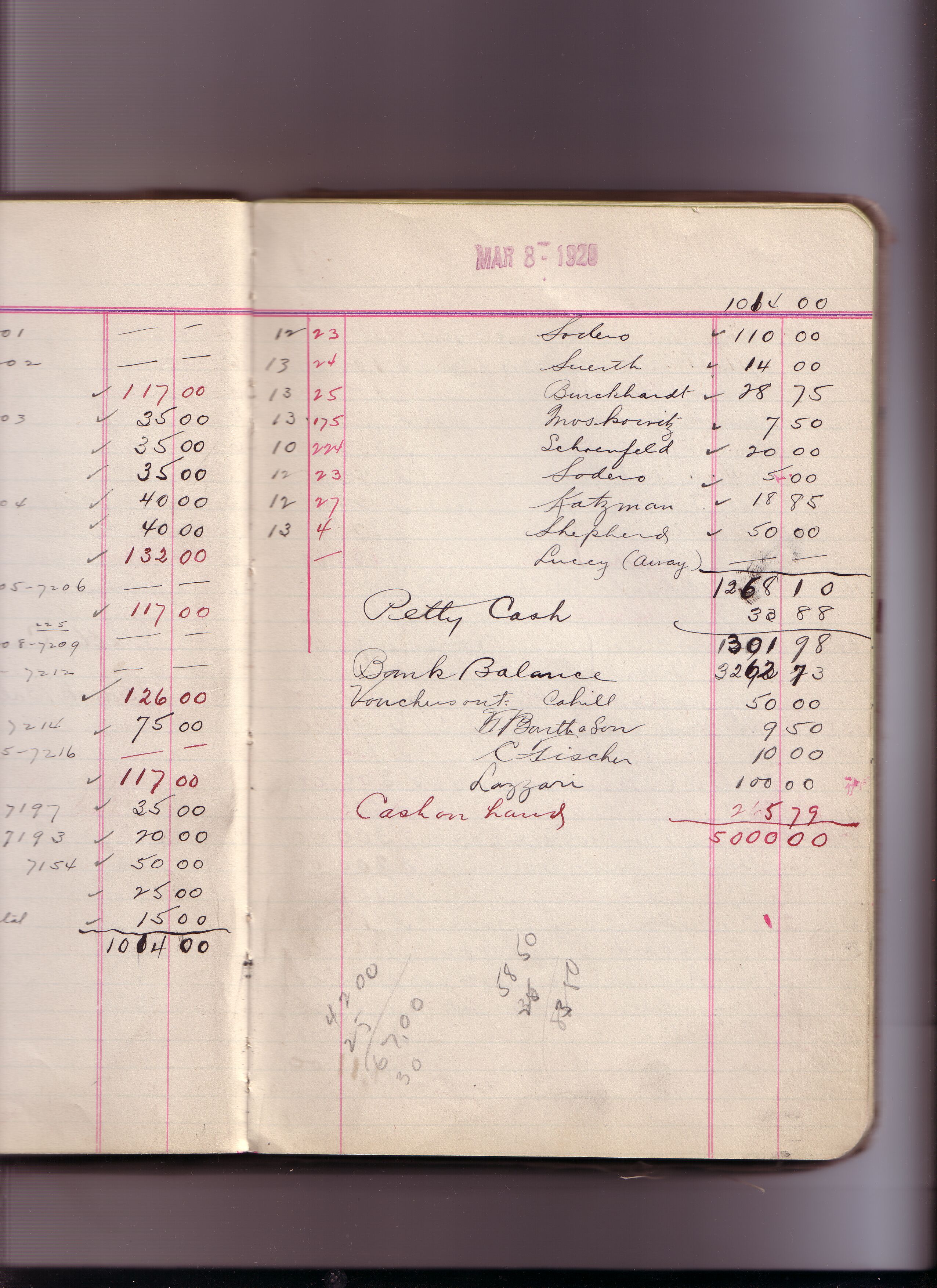 Some of the markings made in pencil in these cash books were made by ENHS Curator Leah Burt during the 1970s and/or early 1980s. For Leah Burt handwriting examples see pages for: December 19, 1921 (cash book 17) ; February 12, 1923 (cash book 17) ; October 27, 1924 (cash book 18) ; December 01, 1925 (cash book 19).