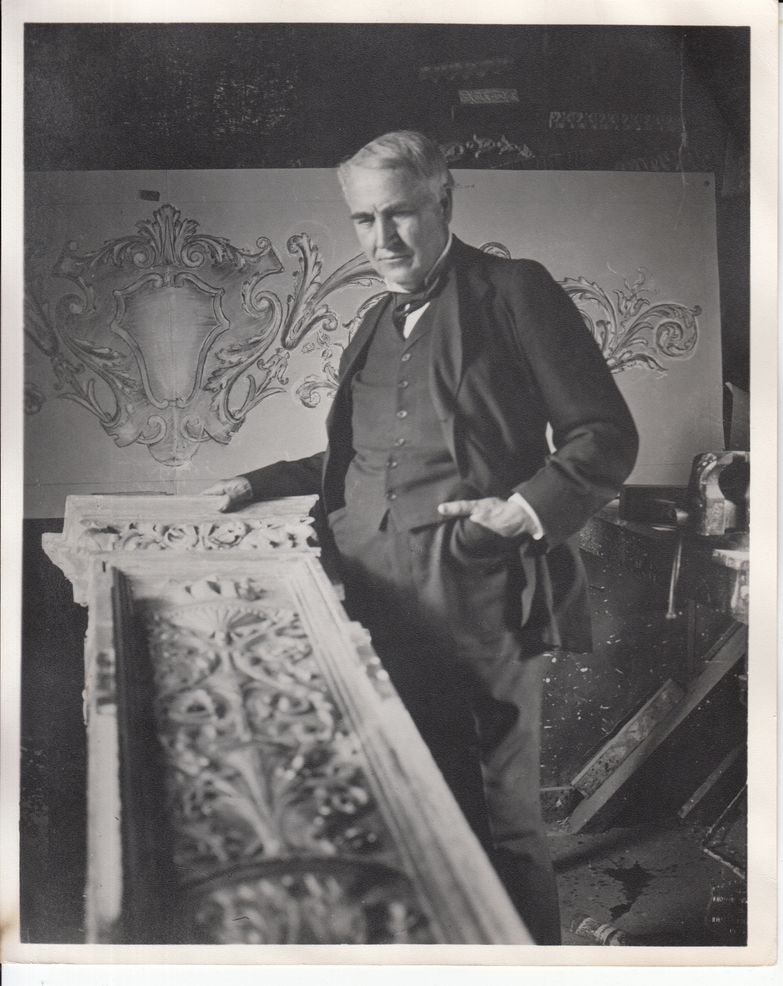 Thomas Edison with full-sized cement column for balcony of cement house.