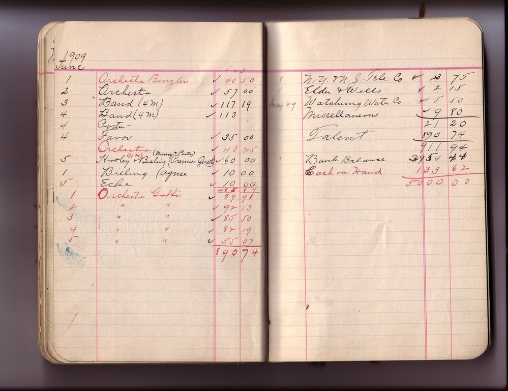 Thomas Edison's New York City Recording Studio Cash Book 05 (of 21), Image 37 (of 88). (Notebook #: PN-08-11-16, NPS catalog #: EDIS 1416), This book documents expenditures for recording artist fees and other payments authorized by studio manager Walter H. Miller from November 16, 1908 – April 01, 1910. Digitally scanned December 2004 through July 2005 at resolution 300 dpi, 24 bit.