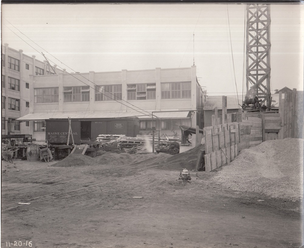 Construction of first half of Building 21, viewed from yard.