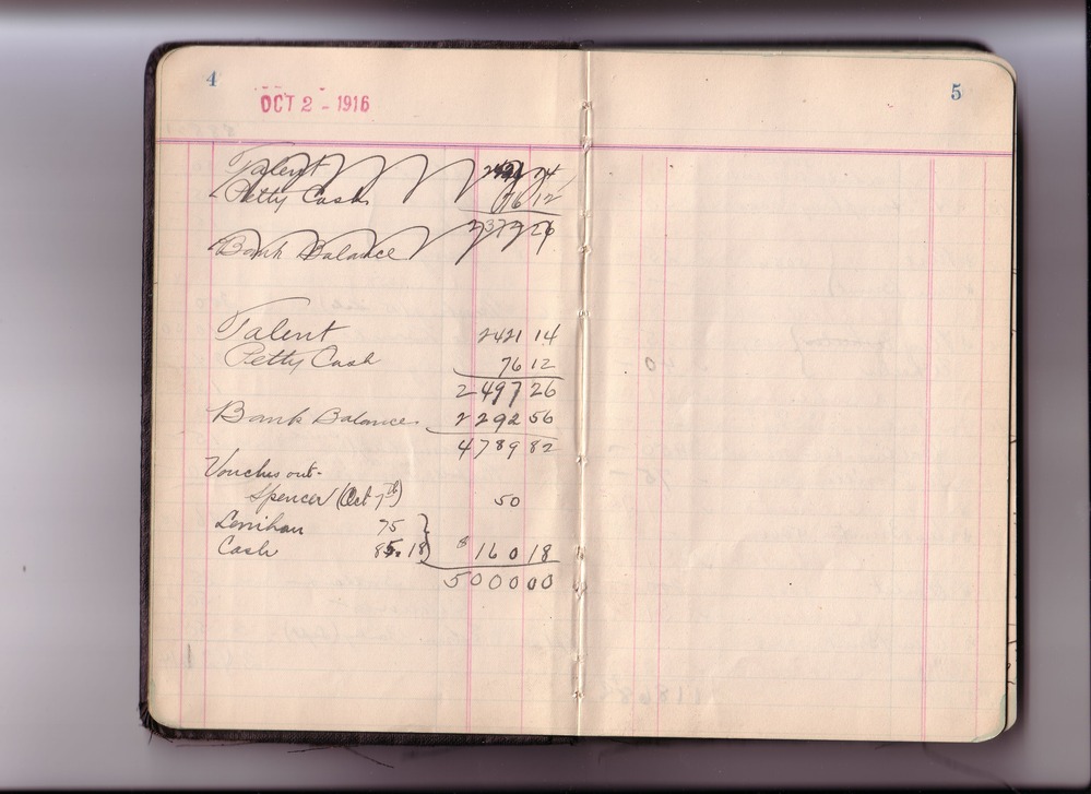 Thomas Edison's New York City Recording Studio Cash Book 14 (of 21), Image 05 (of 64). (Notebook #: PN-16-10-02, NPS catalog #: EDIS 1425), This book documents Diamond Disc matrices 5032 – 5528, expenditures for recording artist fees and other payments authorized by studio manager Walter H. Miller from October 02, 1916 – April 30, 1917. Digitally scanned December 2004 through July 2005 at resolution 300 dpi, 24 bit.