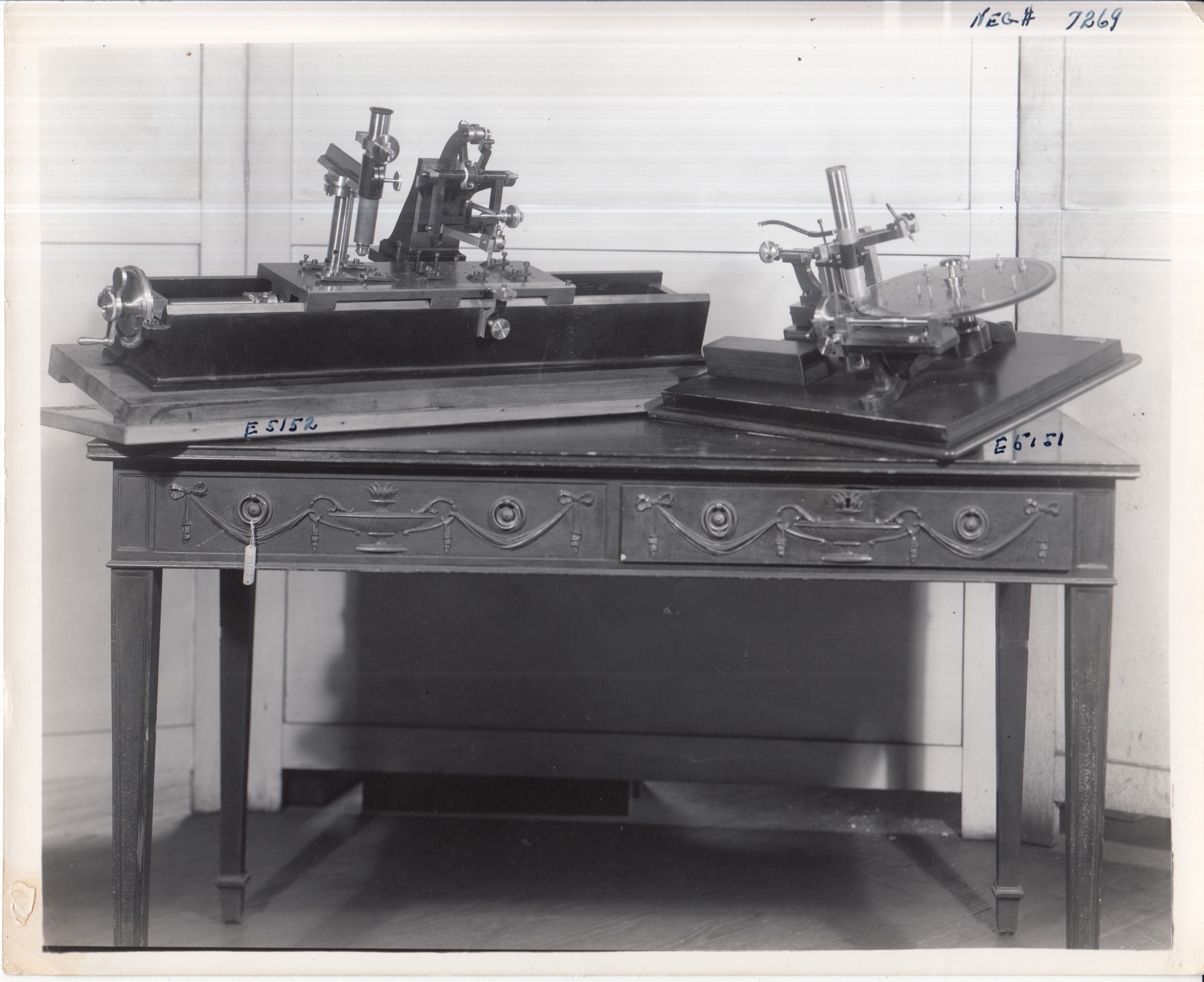 Edison artifacts displayed on table, linear dividing engine and circular dividing engine.