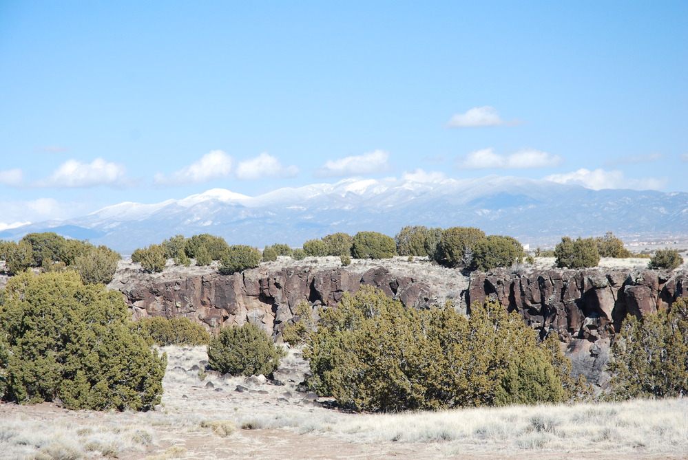 Rock formations with snow covered mountains in the background at La Bajada Mesa near Santa Fe, NM; https://www.nps.gov/nr/travel/el_camino_real_de_tierra_adentro/la_bajada_mesa.html