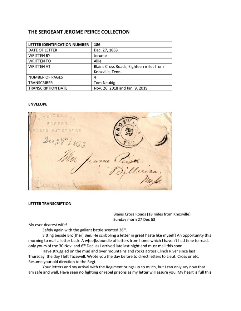 Primarily letters written during the American Civil War by Jerome Peirce, 36th Regiment of Massachusetts Volunteers, to his wife from late 1862 until May 1864, when he was killed in action. Also includes a few letters from Peirce's wife and other correspondence to and from other Peirce family members and friends.
