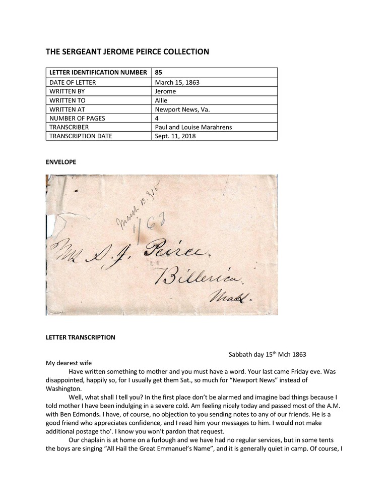 Primarily letters written during the American Civil War by Jerome Peirce, 36th Regiment of Massachusetts Volunteers, to his wife from late 1862 until May 1864, when he was killed in action. Also includes a few letters from Peirce's wife and other correspondence to and from other Peirce family members and friends.