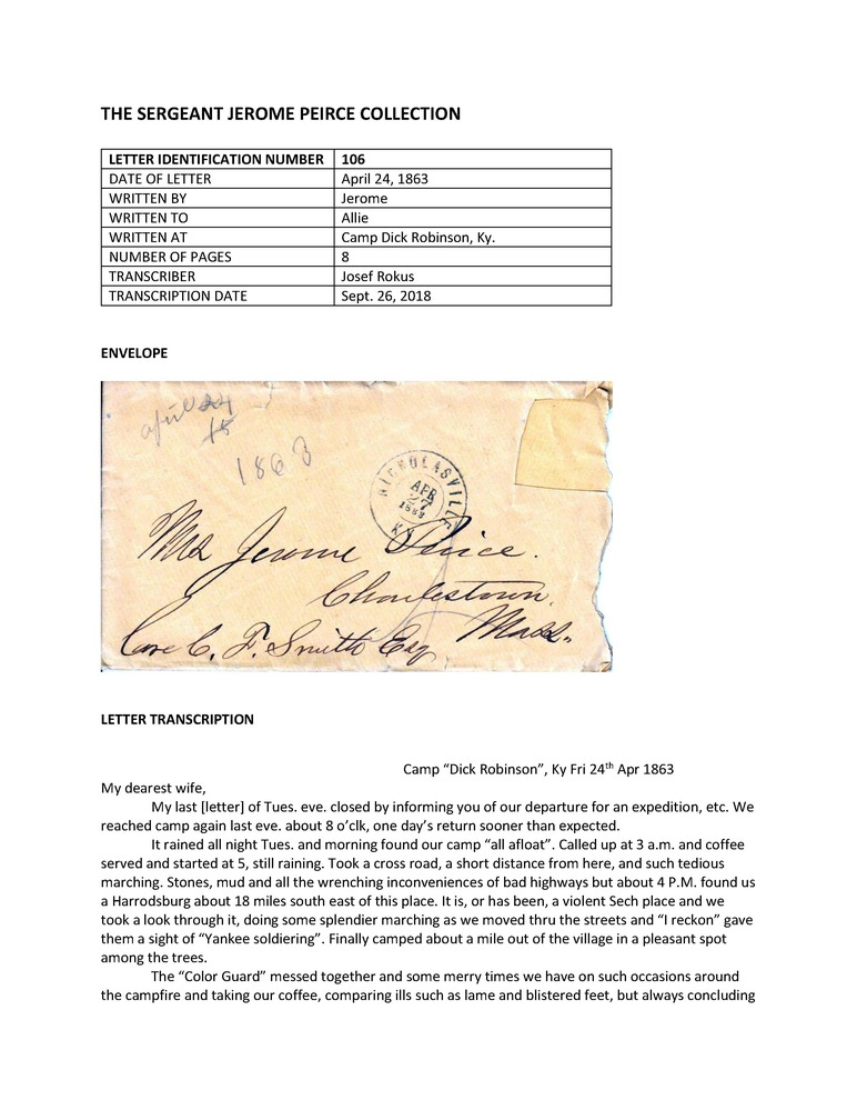 Primarily letters written during the American Civil War by Jerome Peirce, 36th Regiment of Massachusetts Volunteers, to his wife from late 1862 until May 1864, when he was killed in action. Also includes a few letters from Peirce's wife and other correspondence to and from other Peirce family members and friends.
