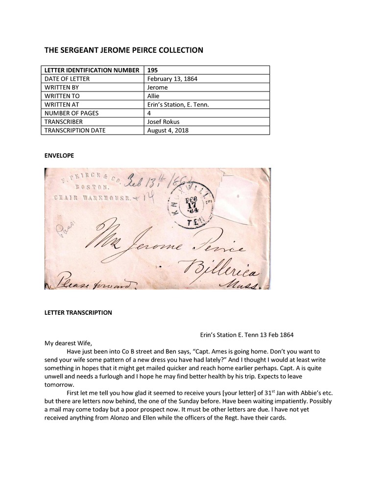 Primarily letters written during the American Civil War by Jerome Peirce, 36th Regiment of Massachusetts Volunteers, to his wife from late 1862 until May 1864, when he was killed in action. Also includes a few letters from Peirce's wife and other correspondence to and from other Peirce family members and friends.