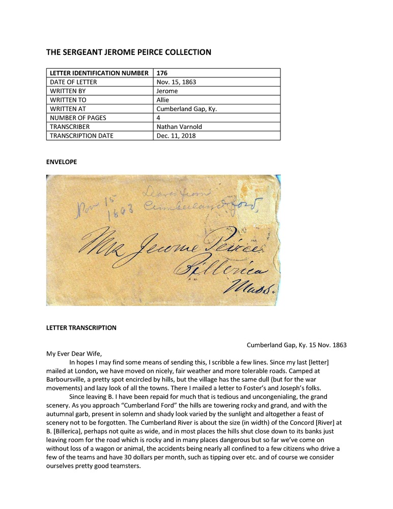 Primarily letters written during the American Civil War by Jerome Peirce, 36th Regiment of Massachusetts Volunteers, to his wife from late 1862 until May 1864, when he was killed in action. Also includes a few letters from Peirce's wife and other correspondence to and from other Peirce family members and friends.