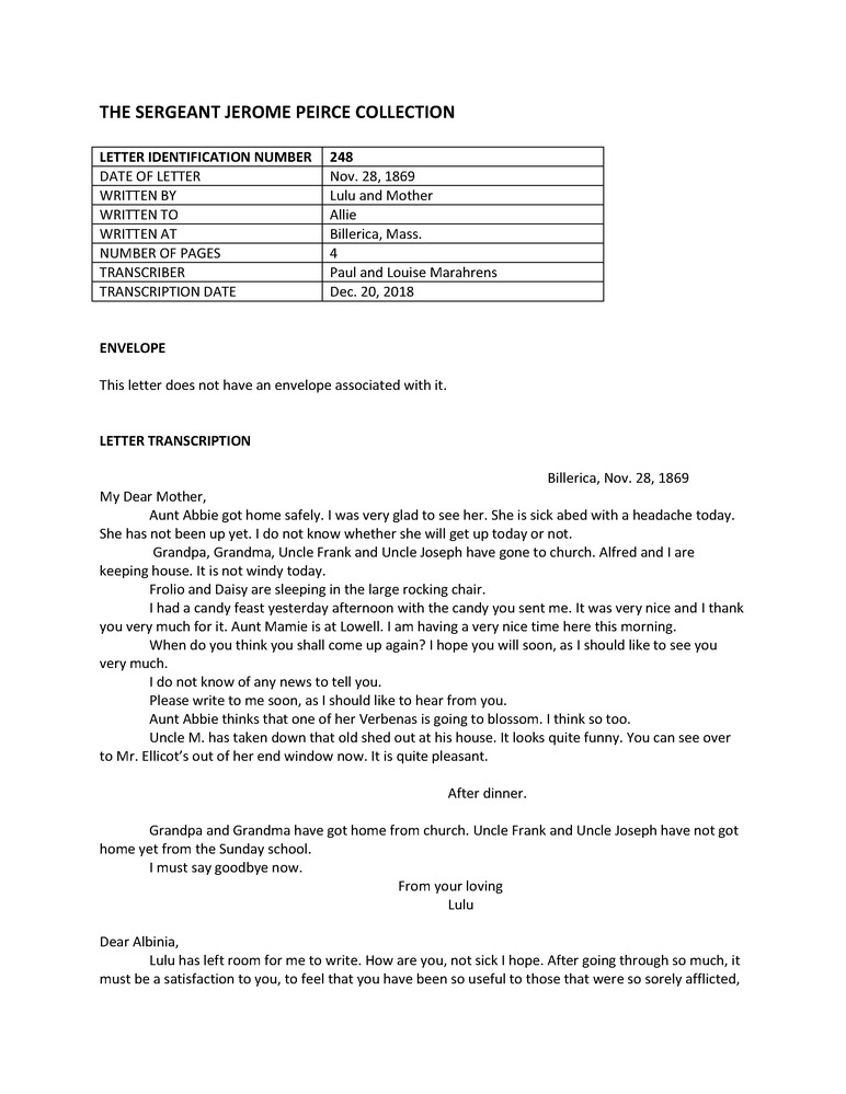 Primarily letters written during the American Civil War by Jerome Peirce, 36th Regiment of Massachusetts Volunteers, to his wife from late 1862 until May 1864, when he was killed in action. Also includes a few letters from Peirce's wife and other correspondence to and from other Peirce family members and friends.