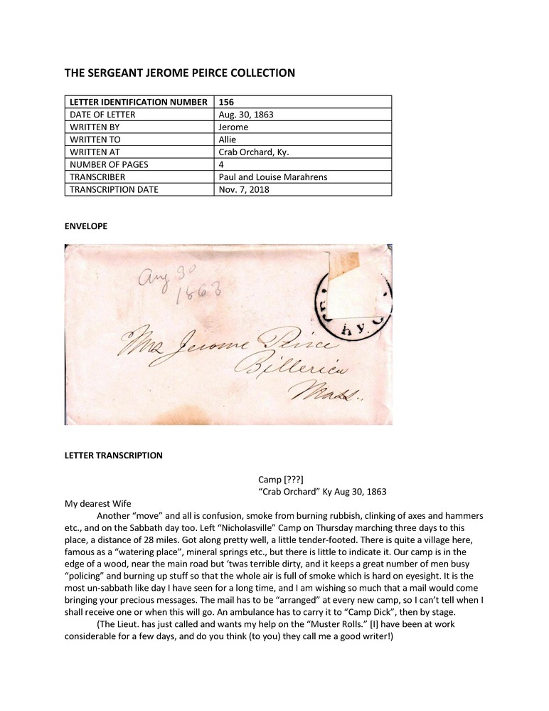 Primarily letters written during the American Civil War by Jerome Peirce, 36th Regiment of Massachusetts Volunteers, to his wife from late 1862 until May 1864, when he was killed in action. Also includes a few letters from Peirce's wife and other correspondence to and from other Peirce family members and friends.