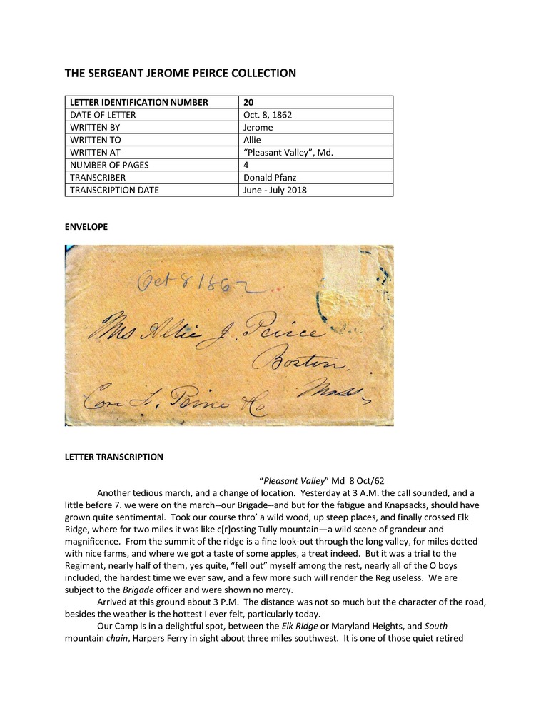 Primarily letters written during the American Civil War by Jerome Peirce, 36th Regiment of Massachusetts Volunteers, to his wife from late 1862 until May 1864, when he was killed in action. Also includes a few letters from Peirce's wife and other correspondence to and from other Peirce family members and friends.