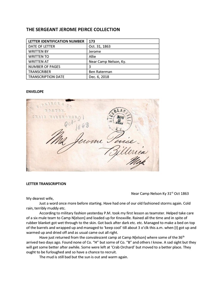 Primarily letters written during the American Civil War by Jerome Peirce, 36th Regiment of Massachusetts Volunteers, to his wife from late 1862 until May 1864, when he was killed in action. Also includes a few letters from Peirce's wife and other correspondence to and from other Peirce family members and friends.