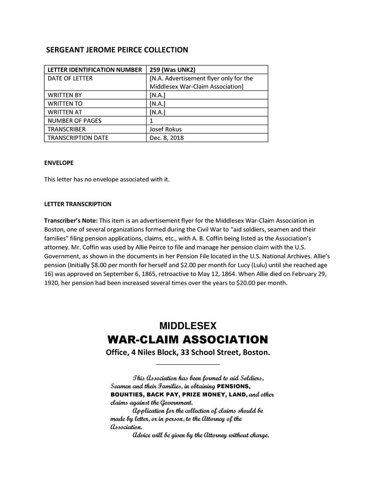 Primarily letters written during the American Civil War by Jerome Peirce, 36th Regiment of Massachusetts Volunteers, to his wife from late 1862 until May 1864, when he was killed in action. Also includes a few letters from Peirce's wife and other correspondence to and from other Peirce family members and friends.
