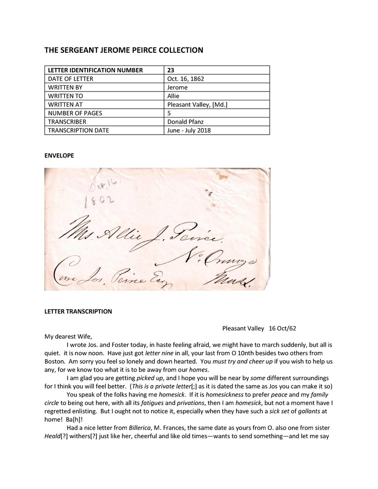 Primarily letters written during the American Civil War by Jerome Peirce, 36th Regiment of Massachusetts Volunteers, to his wife from late 1862 until May 1864, when he was killed in action. Also includes a few letters from Peirce's wife and other correspondence to and from other Peirce family members and friends.